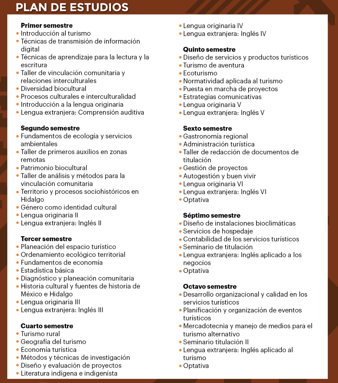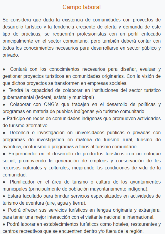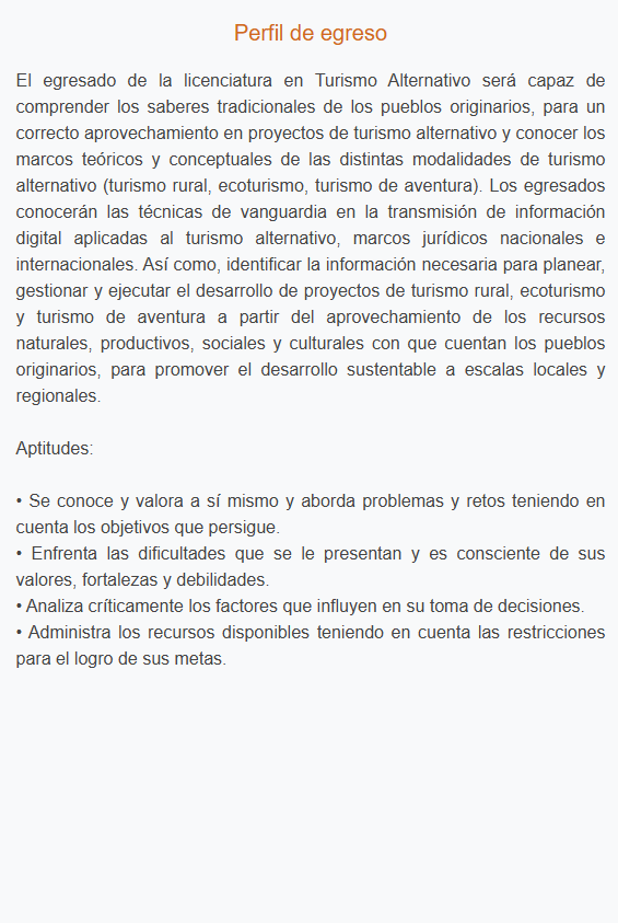 Formar profesionales capaces de planear, organizar, ejecutar y gestionar proyectos de turismo alternativo, mediante la aplicación de metodologías de acción-participación para analizar las áreas de oportunidad de la región. Por lo cual, los estudiantes de turismo alternativo lograrán integrar los conocimientos de la conservación biocultural, aprovechando recursos naturales y culturales endémicos, que permita la inclusión de estos proyectos en la economía local y regional; promoviendo una economía social en mercados de comercio justo para turistas y actores locales.
